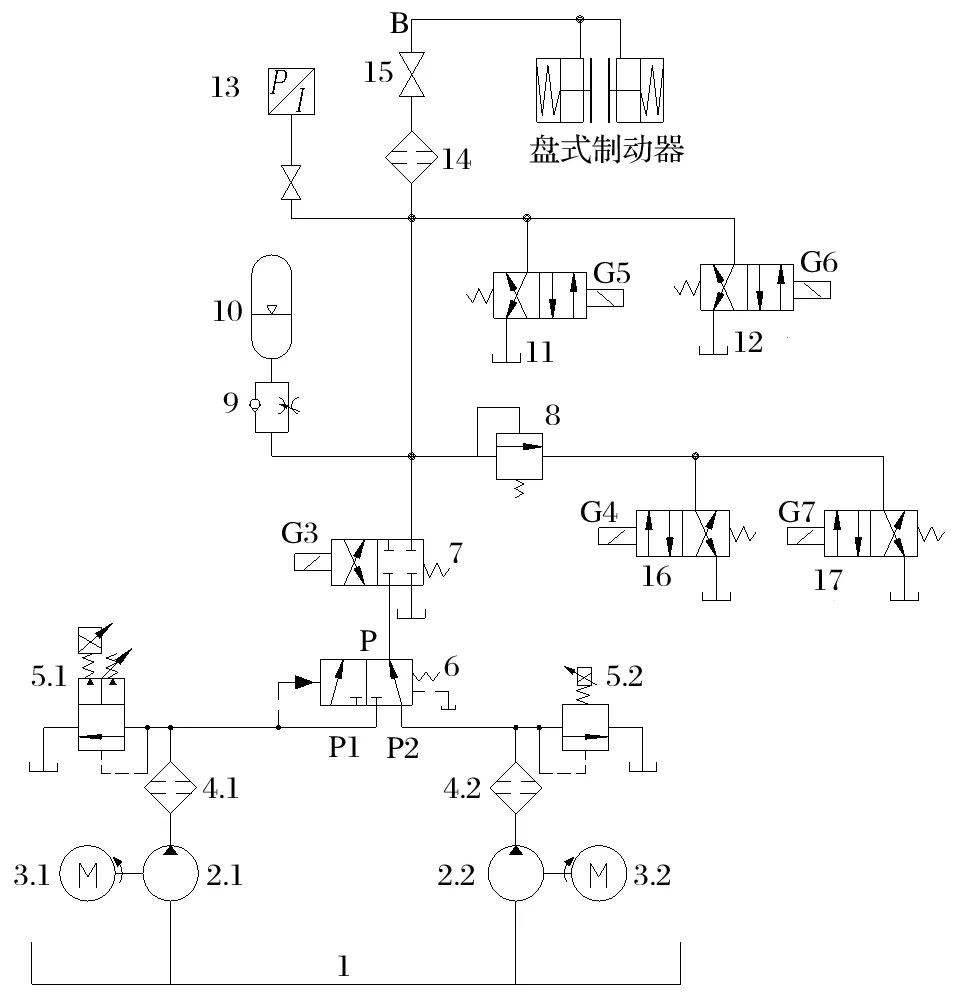 液壓站可以為盤(pán)式制動(dòng)器提供不同油壓的壓力油,油壓的變化由電液比例溢流閥來(lái)調(diào)節(jié)。制動(dòng)系統(tǒng)正常工作時(shí),電動(dòng)機(jī) 3.1 通電,電磁鐵 G3、G4、G5、G6、G7 得電,液壓泵 2.1 的壓力油經(jīng)過(guò)過(guò)濾器4.1、液動(dòng)換向閥 6、電磁換向閥 7、過(guò)濾器 14、球閥15 和出油口 B 進(jìn)入盤(pán)式制動(dòng)器。司機(jī)可以通過(guò)調(diào)節(jié)比例溢流閥 5.1 的比例電磁鐵,以控制電壓實(shí)現(xiàn)油壓的變化,從而達(dá)到調(diào)節(jié)制動(dòng)力矩的目的。當(dāng)控制電壓增加時(shí),系統(tǒng)油壓升高,制動(dòng)器開(kāi)閘;當(dāng)控制電壓減小時(shí),制動(dòng)系統(tǒng)油壓下降,制動(dòng)器合閘;當(dāng)控制電壓減小至零時(shí),制動(dòng)系統(tǒng)的油壓很低,降為殘壓,提升機(jī)處于完全制動(dòng)狀態(tài)。