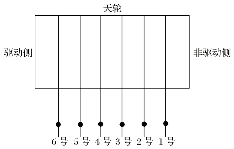 3 故障診斷分析3.1 鋼絲繩張力測試分析 鋼絲繩張力測試在 2 種工況下進(jìn)行,分別是配重在井口時(shí)和配重在井底時(shí)。測試時(shí),提升機(jī)要保持靜止?fàn)顟B(tài),用小錘依次敲擊鋼絲繩,并用測振儀器記錄數(shù)據(jù)。從非驅(qū)動(dòng)側(cè)到驅(qū)動(dòng)側(cè)的鋼絲繩編號為 1~6,如圖 2 所示。鋼絲繩振動(dòng)測試結(jié)果如表 1 所列。