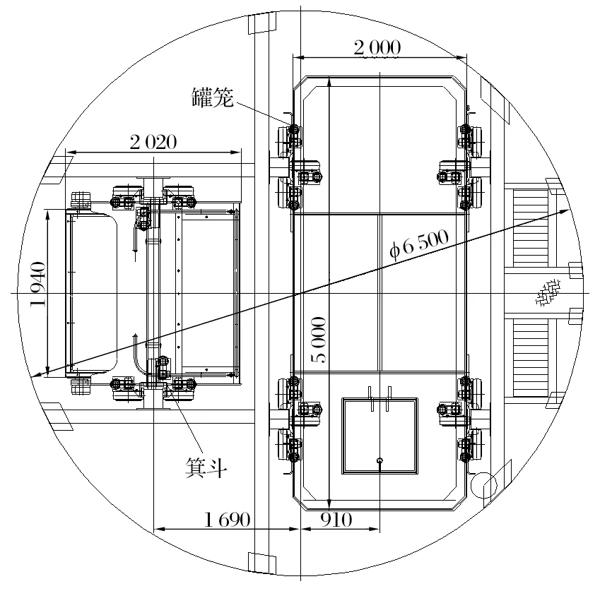 會澤礦業(yè)分公司3號豎井的井筒直徑為6.5 m,井筒布置為1臺箕斗配合1臺罐籠的混合提升方式。箕斗斷面為1 940 mm×2 0.0mm,罐籠斷面為5 0.0mm×2 0.0mm,井筒布置如圖1所示。箕斗有效容積為13 m3,zui大載重 30.35t,自重 38 t,4 根尾繩總質(zhì)量為118.39 t,因此箕斗終端載荷為186.74 t。罐籠配合箕斗提升,自重 38 t,4 根尾繩總質(zhì)量為118.39 t,罐籠采用雙層結(jié)構(gòu)。
