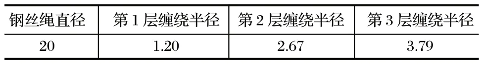 式中:dij 為第 j 股中的第 i 個鋼絲繩只有一根鋼絲繩時的直徑值,mm;Eij 為第 j 個單根鋼絲繩的彈性模量;Kij 為在第 j 股中的第 i 個鋼絲繩層在進行變形前后的曲率,(°)/mm。